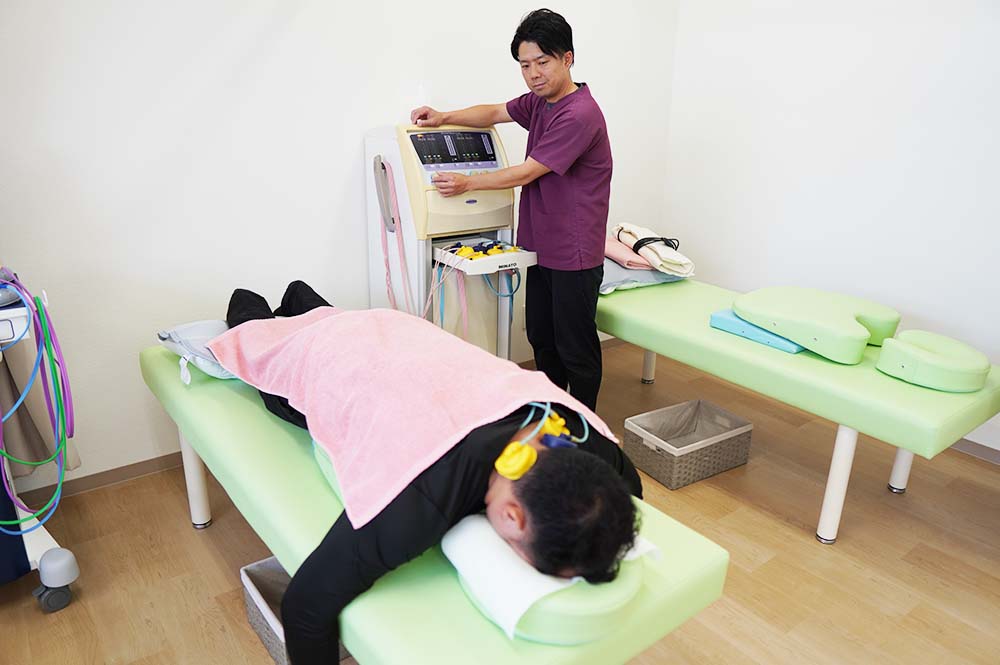 電気刺激を用いて筋肉の緊張と弛緩をリズミカルに行い、「筋緊張の緩和」「血行促進」「痛みの緩和」「ケガの回復」などの作用が期待できます。